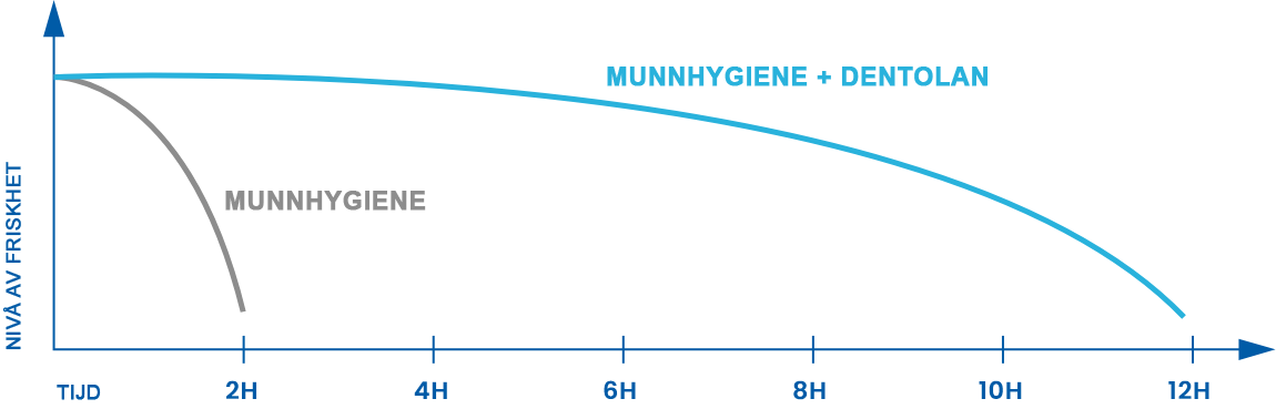 Som grafen viser, lar Dentolan i kombinasjon med munnhygiene deg oppnå en mye lengre effekt av friskhet sammenlignet med munnhygiene alene.
